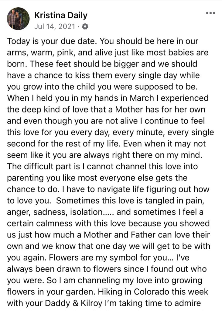 On July 14, 2021 I received a video from many of my coworkers…sharing their beautiful words, sharing how you had changed their lives, and showing their support. Your Daddy and I took Kilroy on a short hike, carved your name into a tree, went to the most wonderful spa for massages, and had a dinner just the two of us. I wrote to you a social media post that poured out from my soul… and the whole day you were on our minds.